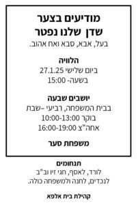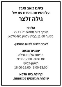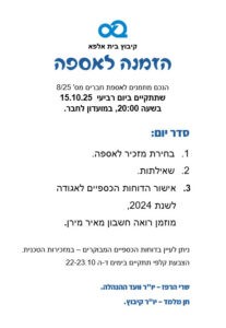 קיבוץ בית אלפא הזמנה לאספה (שיחת קיבוץ) הנכם מוזמנים לאספת חברים מס' 9/25 שתתקיים ביום רביעי 24.12.25 בשעה 20:00, במועדון לחבר. (האספה תשודר גם בזום