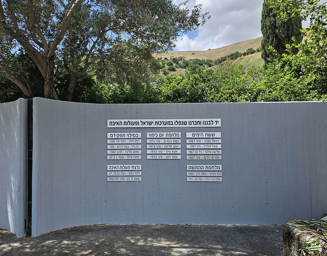 הקיר כולל את המלחמות, שמות הנופלים, מקום ותאריך.