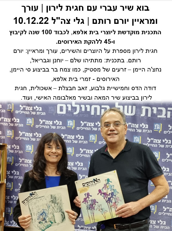 בוא שיר עברי עם חגית לירון | עורך ומראיין יורם רותם | גלי צה"ל 10.12.22 התכנית מוקדשת ליוצרי בית אלפא, לכבוד 100 שנה לקיבוץ ו-45 ללהקת האירוסים. חגית לירון מספרת על היוצרים והשירים, עורך ומראיין: יורם רותם. בתכנית: מתתיהו שלם – יוחנן וגבריאל, נחצ'ה היימן – זרעים של מסטיק, כמו צמח בר בביצוע סי היימן, […]